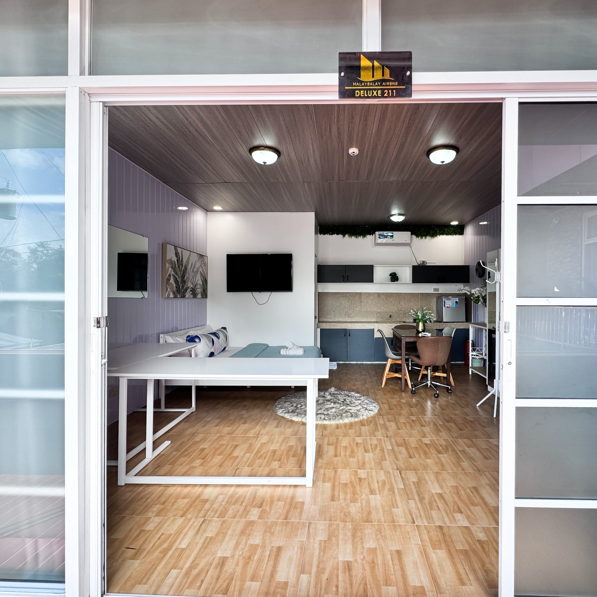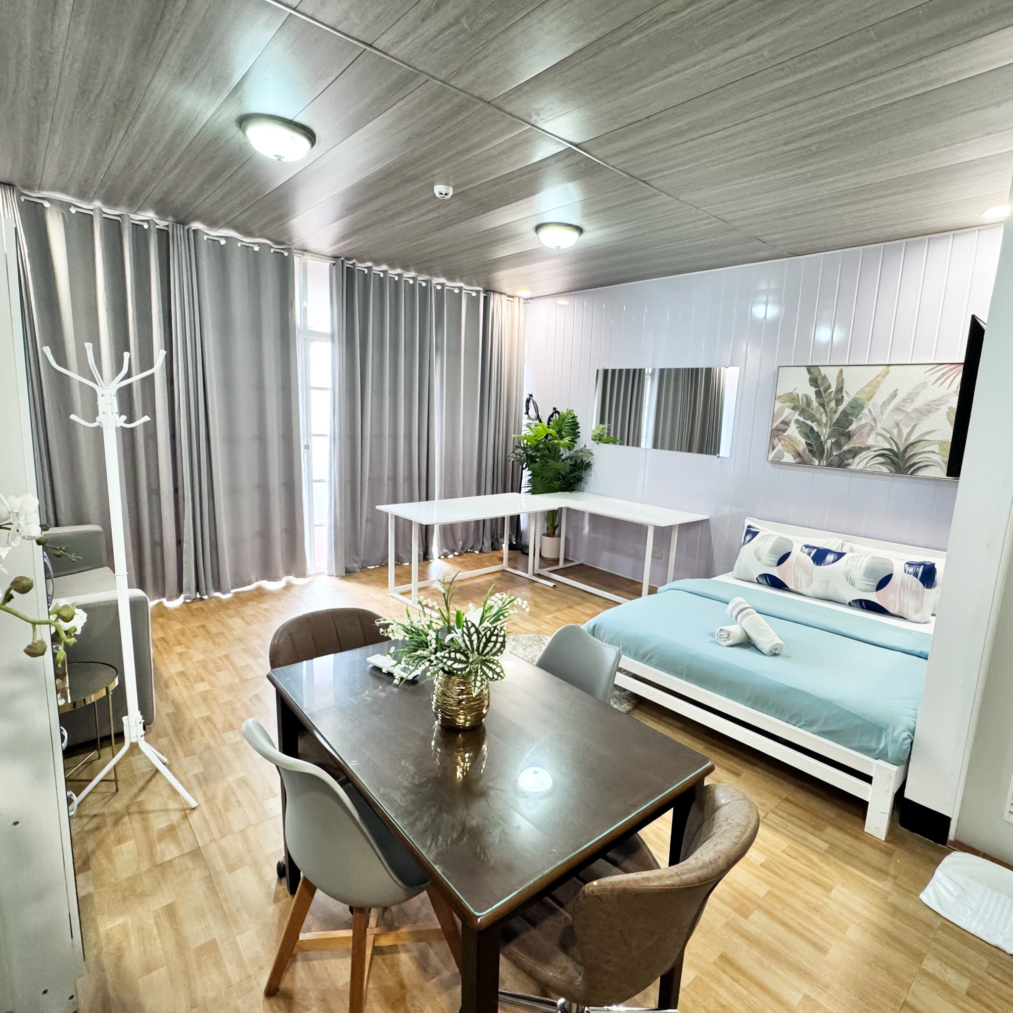 Clean and cozy rooms with private bathroom/comfort room, air condition, mini fridge, dining table, hot & cold shower, fresh linens, toiletries, electric kettle & mugs, free wifi, complimentary breakfast, mini living area, wardrobe or closet, vanity area with mirror and chair