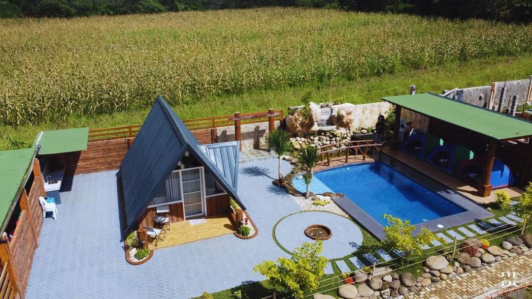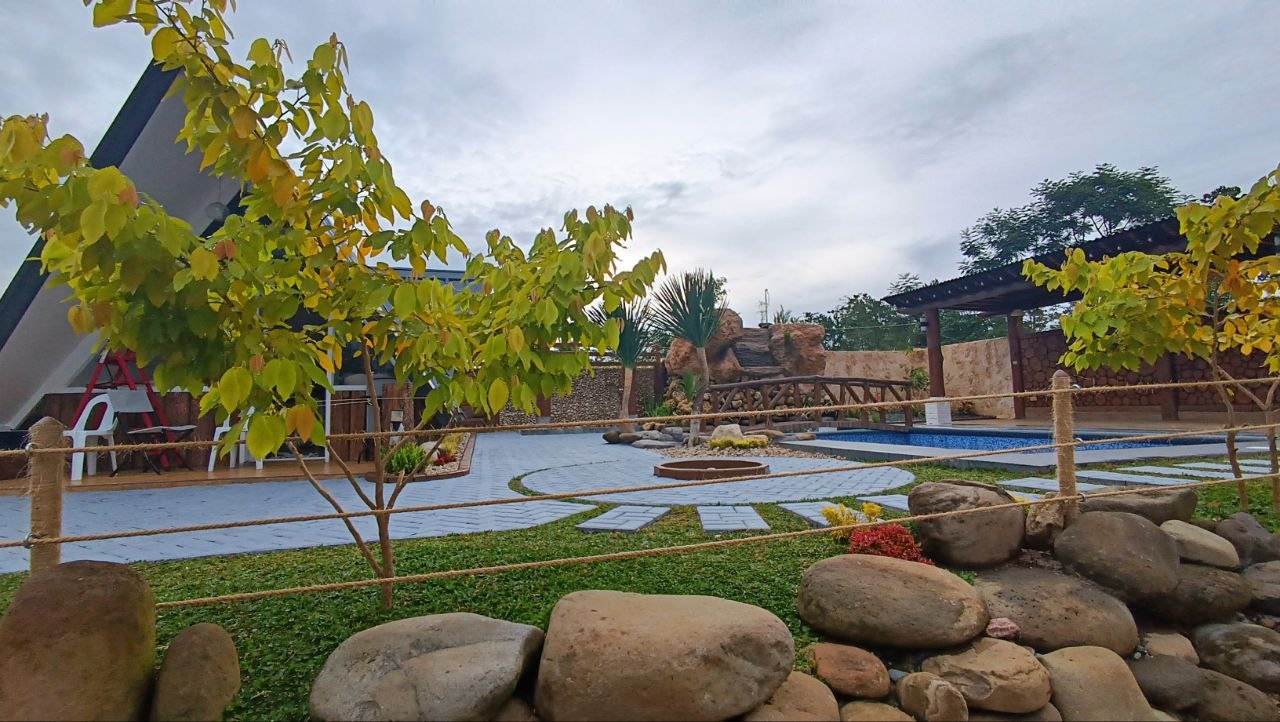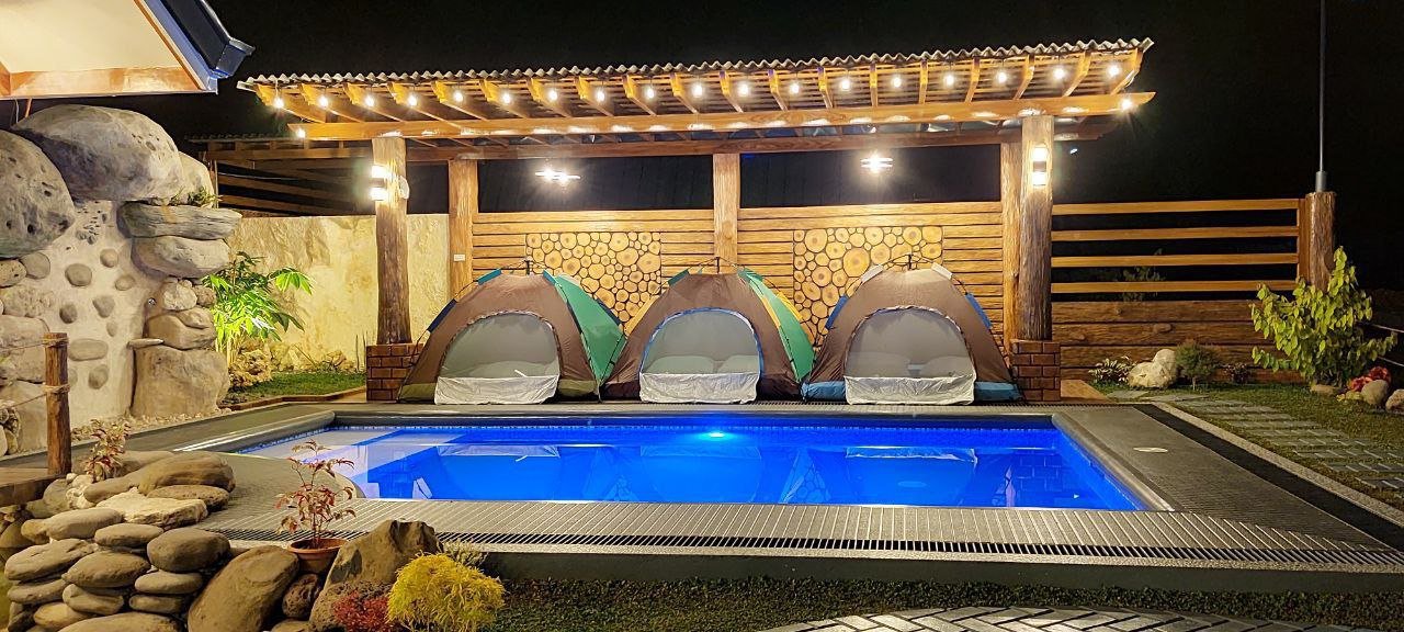 ASH Cabin offers a fully air-conditioned stay with a dining table, private pool, kitchen setup, plates, silverware, karahay, kaldero, and a functional dirty kitchen for outdoor cooking. Guests enjoy fresh toiletries, one A-hose for two, and access to three well-set up tents for 8 PAX