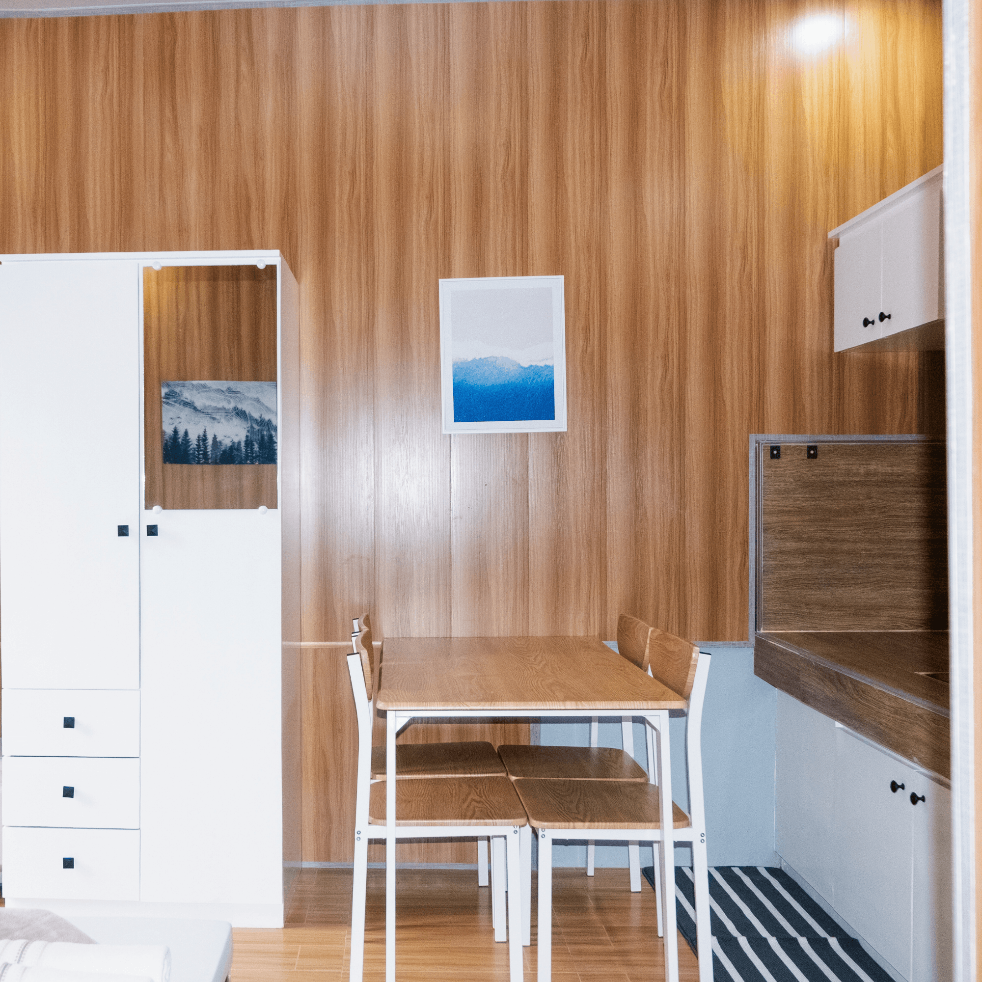 Airconditioned room with dining table, hot & cold shower, fresh toiletries, electric kettle, and mugs—perfect for a comfortable and convenient stay.
