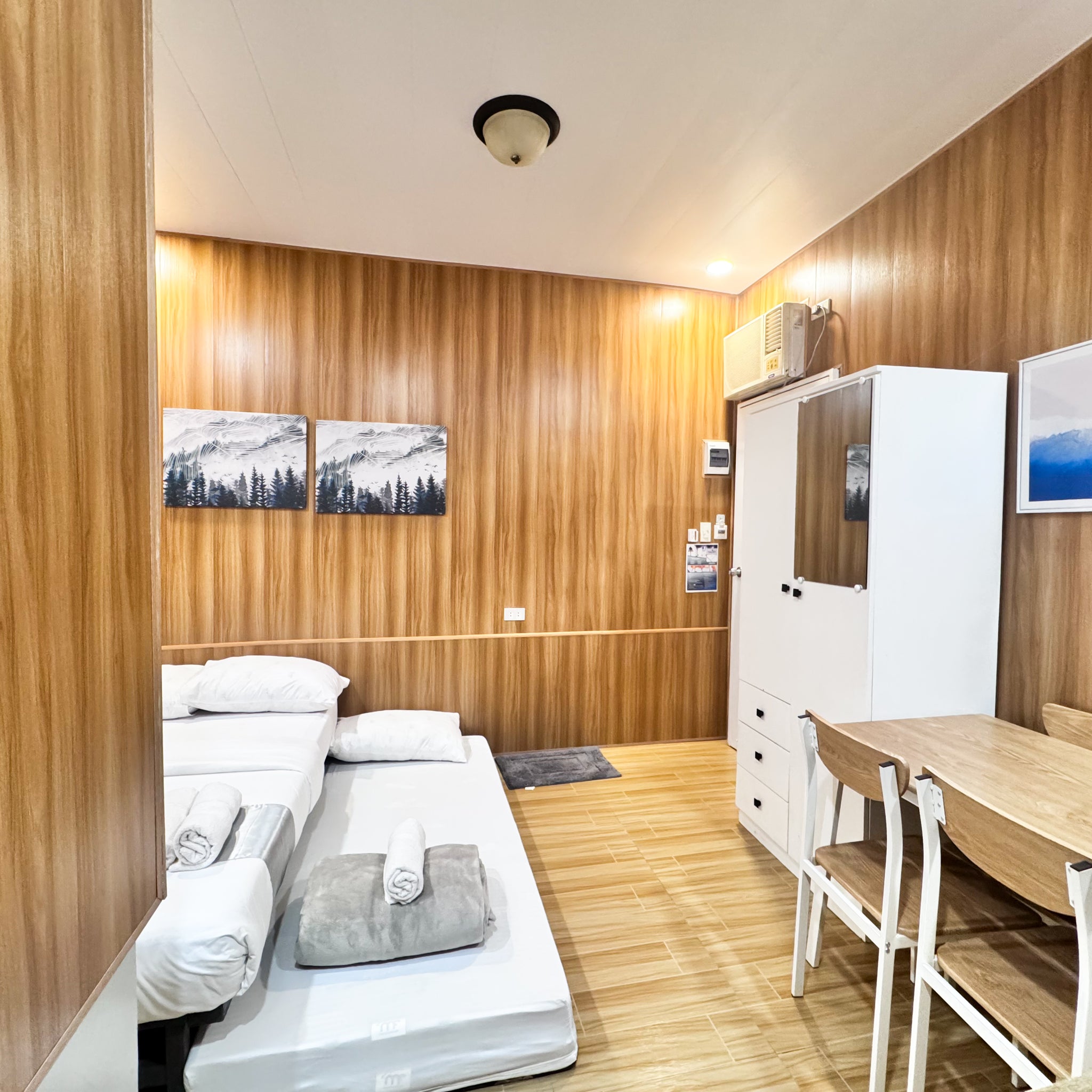 Airconditioned room with dining table, hot & cold shower, fresh toiletries, electric kettle, and mugs—perfect for a comfortable and convenient stay.